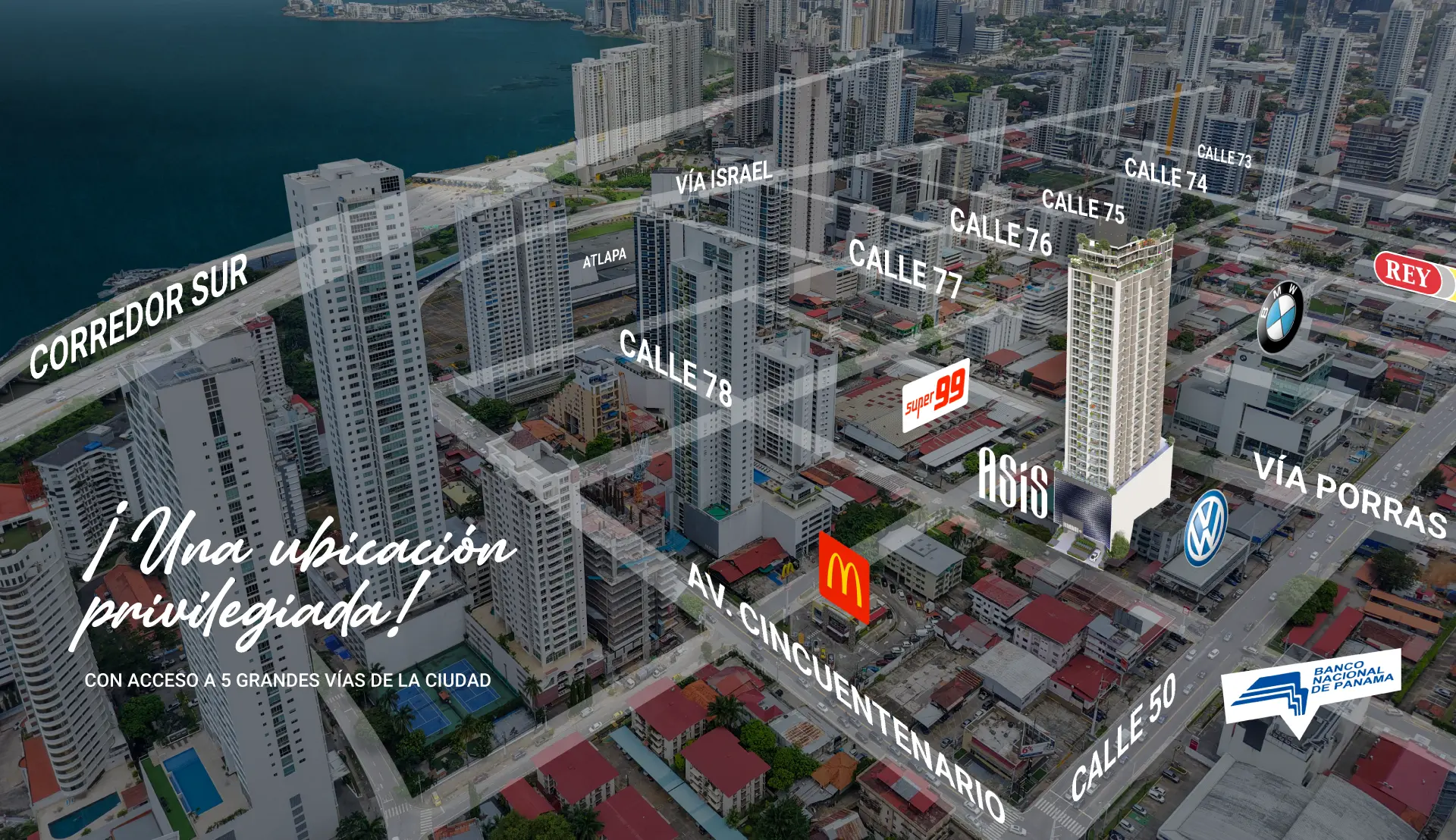 ASIS posee la mejor ubicación de la ciudad, a pasos de supermercados, bancos, restaurantes y todos los servicios a su alcance. Con acceso rápido desde 4 grandes arterias viales: Corredor Sur, Vía Israel, Calle 50 y Vía Porras.